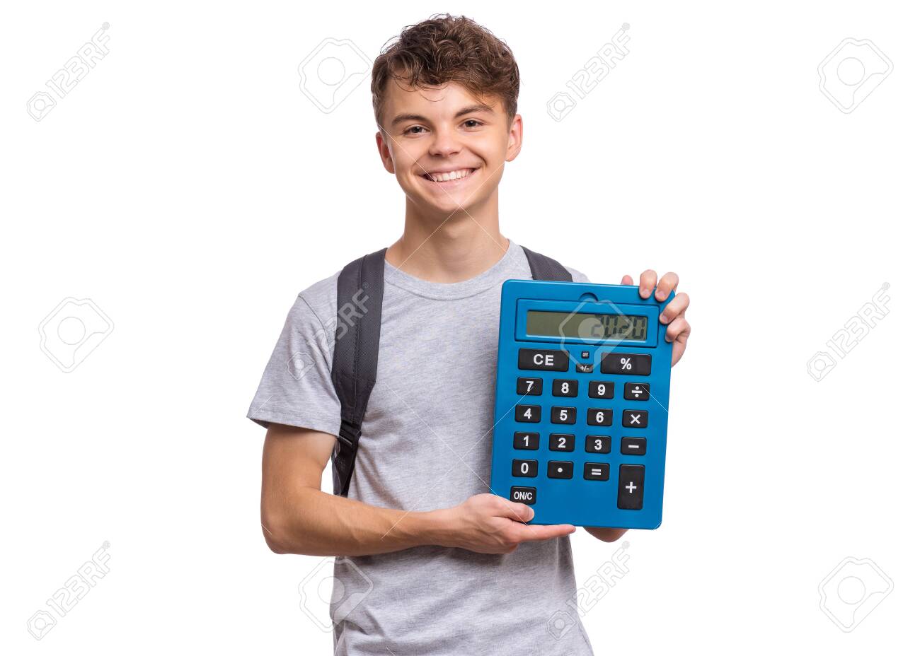 Smart Student With Backpack Holding Big Calculator Portrait Of Funny Cute Teen Boy Isolated On White Background Happy Child Showing Numerals 2020 On Calculator Back To School Stock Photo Picture And Royalty